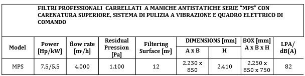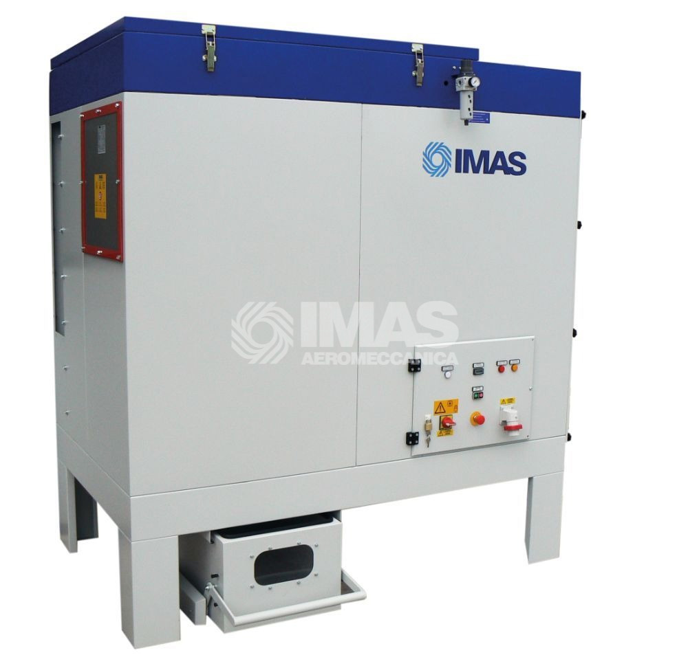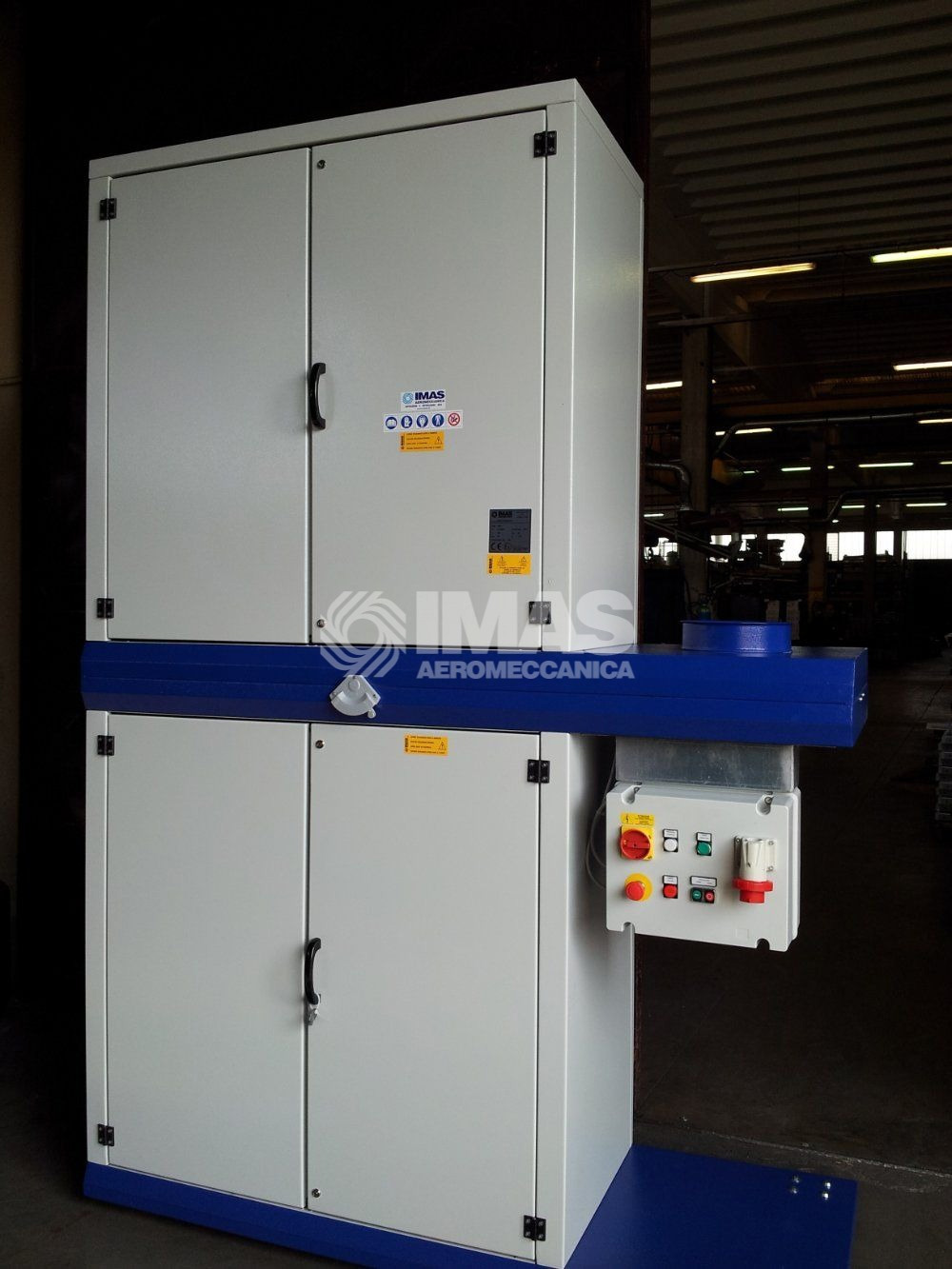 Пылеулавливающие системы с рукавами или картриджами в качестве фильтрующей системы, работающие на отрицательном давлении и с импульсной системой очистки jet-pulse, управляемой контроллером. Оснащаются пылеосадительной камерой по всей длине фильтрующей батареи, предназначены для внутреннего использования, для работы с мелкой пылью, сухим порошком, порошком с низкой влажностью, подходят для лазерного и плазменного оборудования. Изготовлены под контролем качества ISO 9001 на заводах компании IMAS AEROMECCANICA Srl, они поставляются полностью собранными после цикла окраски. Осмотр и любое техническое обслуживание облегчаются наличием большой верхней дверцы, которую можно открыть с помощью пневмоамортизаторов;Вход всасываемого материала — сбоку, непосредственно в большую осадительную камеру, далее материал перемещается в бункер, а затем в контейнер.