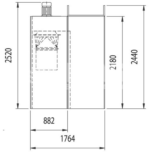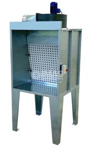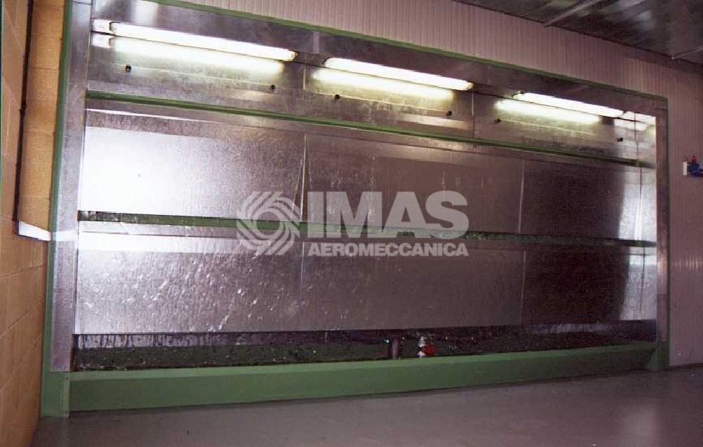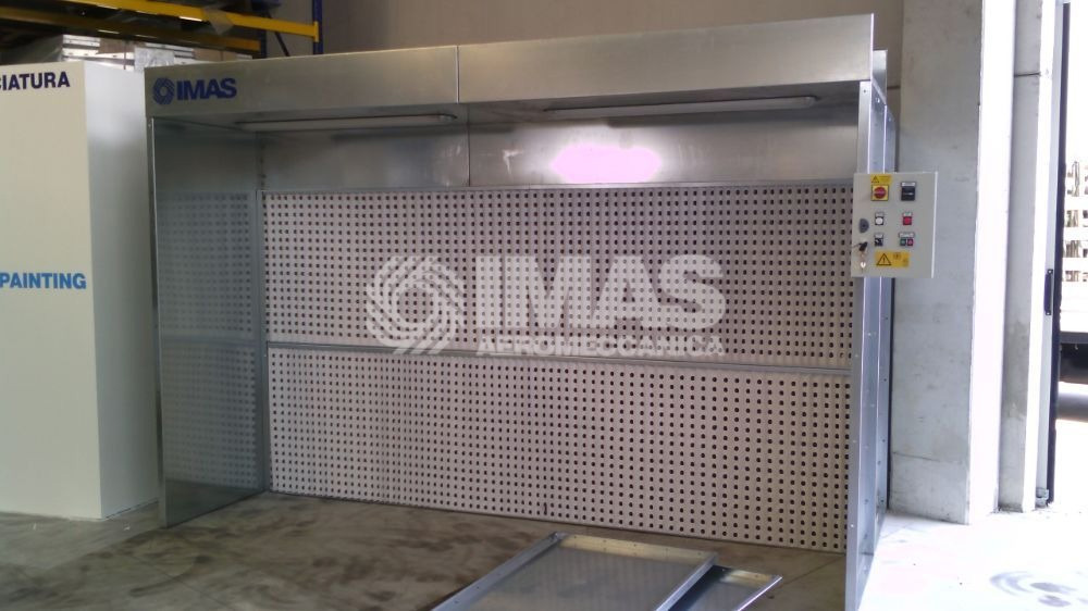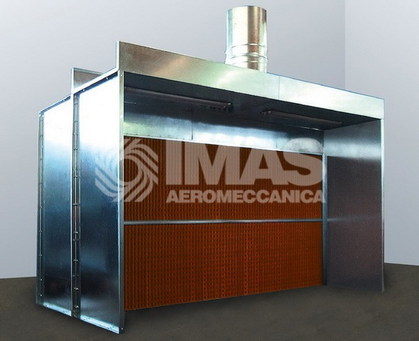 Эта камера, изготовленная из оцинкованных листовых панелей, оборудована электрической панелью со счетчиком рабочих часов, дифференциальным реле давления для сигнализации о засорении фильтра, предохранительным электромагнитным клапаном для работы системы покраски только во время работы камеры, потолочным освещением около 600 люкс, и также она с возможностью установки картриджей с активированным углем. Электрический вентилятор обеспечивает равномерное всасывание по всей поверхности со скоростью, соответствующей действующим нормам ЕС. Камера может быть укомплектована мокрым полом (резервуаром для сбора воды), закрытым металлической решеткой.