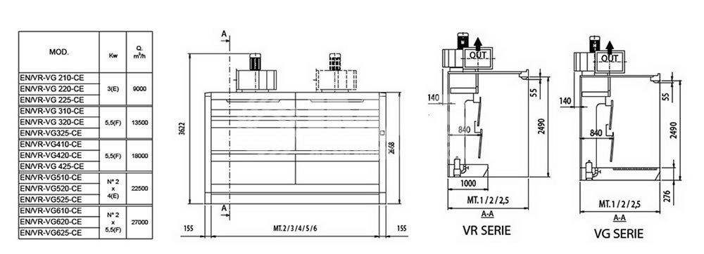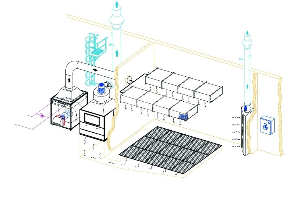Воздух, всасываемый и отфильтрованный из камеры, будет выброшен в атмосферу через вентиляционную трубу увеличенного диаметра, расположенную над крышей, в комплекте с дождевой системой с открытым верхом и отверстиями для взятия проб в соответствии с «UNI 10169».
