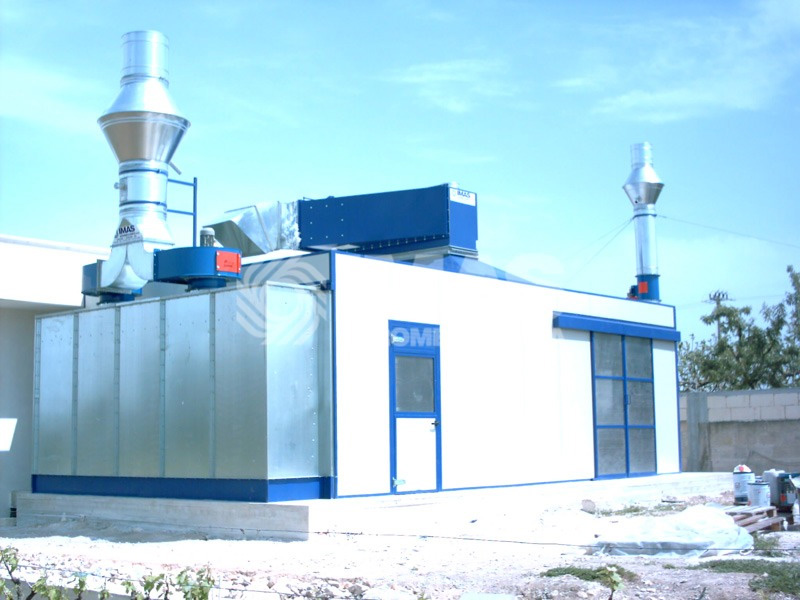Предлагаемый нами бокс состоит из утепленных стен по периметру и утепленного потолка с помощью сэндвич-панелей. Он спроектирован и изготовлен для размещения как покрасочных камер, так и сушильных колонн для удаления паров, выделяемых во время сушки деталей. На крыше, из усиленной гофрированной секции, может быть установлен нагнетатель давления, который реинтегрирует воздух, всасываемый из кабины, и создает избыточное давление внутри бокса.
